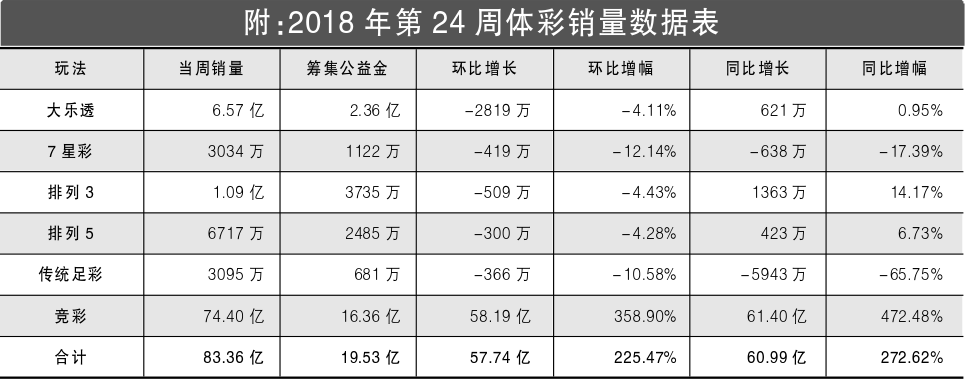 6月11日至17日,体彩全国联销游戏(大乐透、7星彩、排列3、排列5、传统足彩、竞彩)共计销售83.36亿元,筹集公益金19.53亿元。当周销量比上周增加57.74亿元,环比增长225.47%;比去年同期增加60.99亿元,同比增长272.62%。当周共开出6注1000万元及以上头奖,全部出自体彩大乐透。当周进入世界杯时间,竞彩游戏的销量迎来爆发式增长。