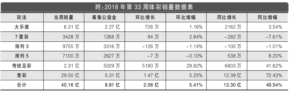 8月13日至19日,体彩全国联销游戏(大乐透、7星彩、排列3、排列5、传统足彩、竞彩)共计销售40.16亿元,筹集公益金8.81亿元。当周销量比上周增加2.06亿元,环比增长5.41%;比去年同期增加13.30亿元,同比增长49.54%。当周共开出13注500万元以上头奖,全部出自大乐透。