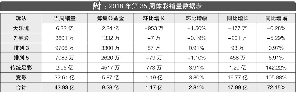 8月27日至9月2日,体彩全国联销游戏(大乐透、7星彩、排列3、排列5、传统足彩、竞彩)共计销售42.93亿元,筹集公益金9.28亿元。当周销量比上周增加1.17亿元,环比增长2.81%;比去年同期增加17.99亿元,同比增长72.15%。当周共开出17注500万元及以上头奖,其中大乐透14注,7星彩2注,足彩1注。竞猜型游戏贡献了当周销售环比和同比增量的绝大部分。