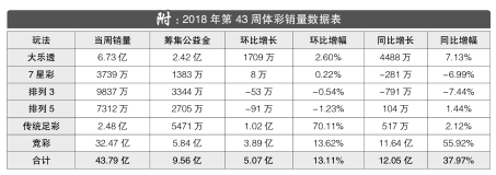 当周竞彩销售32.47亿元,筹集公益金5.84亿元,其中竞彩足球销售29.97亿元,竞彩篮球销售2.50亿元。当周竞彩销量比上周增加3.89亿元,环比增长13.62%;比去年同期增加11.64亿元,同比增长55.92%。当周竞彩足球的受注赛事为309场,比上周多84场;NBA新赛季进入第二周,在竞彩足球和竞彩篮球的双重作用下,当周竞彩游戏销量增长明显。