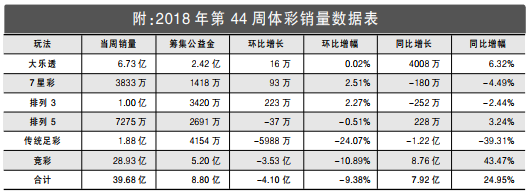 10月29日至11月4日,体彩全国联销游戏(大乐透、7星彩、排列3、排列5、传统足彩、竞彩)共计销售39.68亿元,筹集公益金8.80亿元。当周销量比上周减少4.10亿元,环比降低9.38%;比去年同期增加7.92亿元,同比增长24.95%。当周共开出12注500万元以上头奖,全部出自体彩大乐透。当周,国家体彩中心发布《关于中国体育彩票部分游戏可跨省级行政区域兑奖的公告》,自2018年11月1日起,中国体育彩票大乐透、7星彩、传统足彩和竞彩游戏单注奖金在1万元及以下的中奖彩票,在兑奖有效期内可跨省级行政区域进行兑奖。