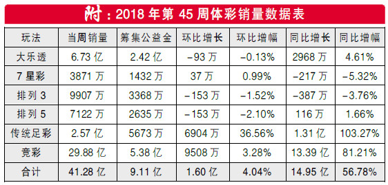 当周竞彩销售29.88亿元,筹集公益金5.38亿元,其中竞彩足球销售26.07亿元,竞彩篮球销售3.81亿元。当周竞彩销量比上周增加9508万元,环比增长3.28%;比去年同期增加13.39亿元,同比增长81.21%。