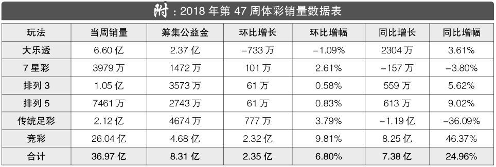 11月19日至25日,体彩全国联销游戏(大乐透、7星彩、排列3、排列5、传统足彩、竞彩)共计销售36.97亿元,筹集公益金8.31亿元。当周销量比上周增加2.35亿元,环比增长6.80%;比去年同期增加7.38亿元,同比增长24.96%。当周共开出4注1000万元及以上头奖,全部出自体彩大乐透。当周销量的环比和同比增量多来自竞彩。
