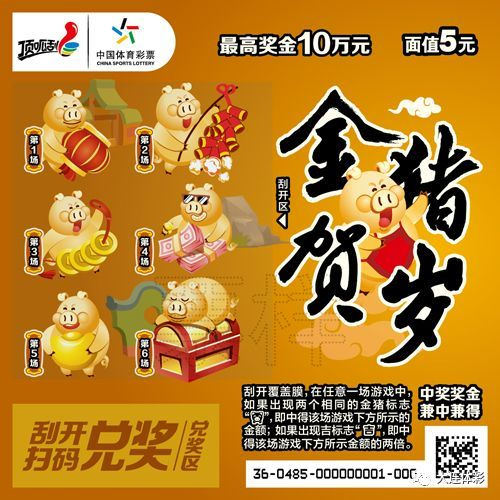 5元面值“金猪贺岁”,共有6款票面设计,每张彩票有6次中奖机会,头奖10万元。票面为方形,刮开区由6只可爱的金猪组成,分别展示了挂灯笼、耍狮子、压岁钱等春节元素。具体游戏规则为:刮开覆盖膜,在任意一场游戏中,如果出现两个相同的金猪标志,即中得该场游戏下方所示的金额;如果出现“吉”标志,即中得该场游戏下方所示金额的两倍。中奖奖金兼中兼得。“金猪纳财”和“金猪贺岁”的上市,也是顶呱刮自从推出首款贺岁生肖主题票“金牛报春”以来,连续第十一年发行同类主题票。