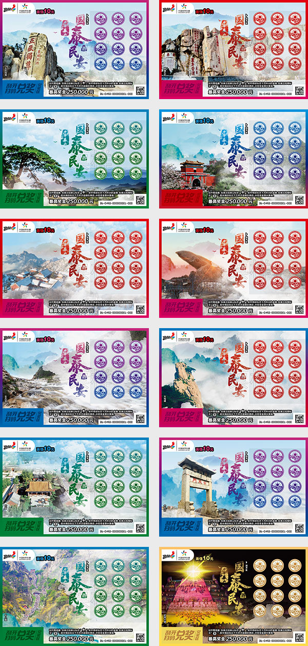近日,中国体育彩票携手泰山景区推出了“国泰民安”旅游主题即开型体育彩票,将于2019年1月1日在泰安市天外村广场进行首发,后续在全国陆续上市。“国泰民安”即开票,共12个票面,展现了泰山景区的经典景点,凸显了泰山人文历史与自然风光,把国泰民安的美好寓意送给全国人民。