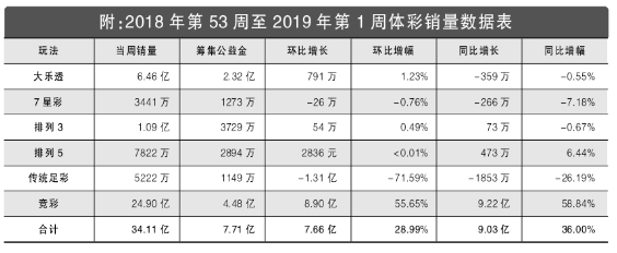 2018年12月31日2019年1月6日,体彩全国联销游戏(大乐透、7星彩、排列3、排列5、传统足彩、竞彩)共计销售34.11亿元,筹集公益金7.71亿元。当周销量比上周增加7.66亿元,环比增长28.99%;比去年同期增加9.03亿元,同比增长36.00%。当周共开出8注500万元及以上头奖,其中体彩大乐透7注,7星彩1注。