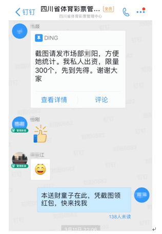 “只要有员工转发这条开奖新闻,我们就为转发者发红包。”马燚说,“红包接力”发起之后,四川省体彩中心全体同仁都在支持这个事,让他感觉“四川体彩人在做一件非常有意义的事”。3月11日晚,大乐透开奖之后三小时内,仅四川省体彩中心就有超200名员工在朋友圈分享了1000万元大奖喜讯,超150人凭朋友圈截图领到了红包;此外,还有超过50个四川体彩的销售主管在自己的辖区网点群组织了“红包接龙”。