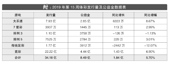 4月8日至14日,体彩全国联销游戏(大乐透、7星彩、排列3、排列5、传统足彩、竞彩)通过34.18亿元的发行量,筹集了8.49亿元公益金。当周发行量比去年同期增加1.84亿元,同比增长5.70%。当周共开出55注1000万元及以上头奖,全部出自体彩大乐透。体彩大乐透自第19019期实施新规则以来,开出的头奖全部为1000万元基本投注或1800万元追加投注的封顶大奖。