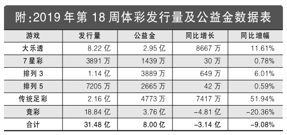 竞彩通过18.84亿元的发行量,筹集了3.76亿元公益金。当周发行量比去年同期减少4.81亿元,同比降低20.36%。