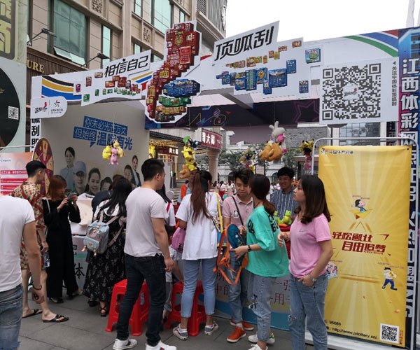 5月15日起,以“轻松创业、自由追梦”为主题的南昌市第二届体育彩票渠道招商月主题地推活动在胜利路步行街火热开启,“温暖有光”中国体育彩票品牌换新也同步亮相。当天累计有近千名市民咨询了体彩门店征召政策,体验了“顶呱刮”即开型体育彩票,现场氛围热烈,反响强烈。