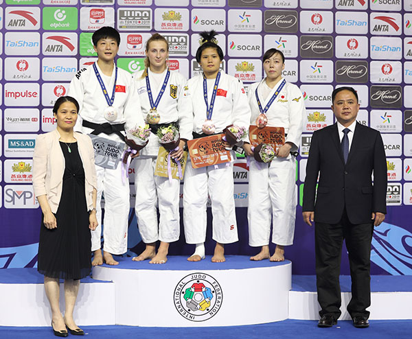 冼冬妹(左一)为2019年“体彩杯”世界柔道大奖赛中国站的获奖选手颁奖