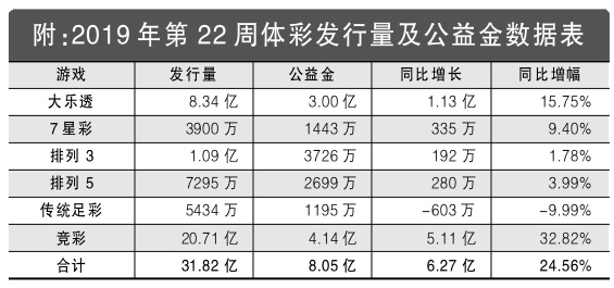 5月27日至6月2日,体彩全国联销游戏(大乐透、7星彩、排列3、排列5、传统足彩、竞彩)通过31.82亿元的发行量,筹集了8.05亿元公益金。当周发行量比去年同期增加6.27亿元,同比增长24.56%。当周共开出9注1000万元及以上头奖,全部出自体彩大乐透。当周的同比增量多来自大乐透和竞彩。