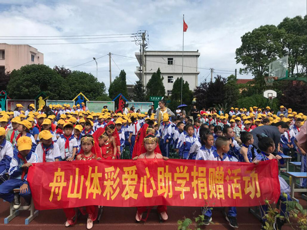 2017年至今,舟山市体彩中心为育才学校向阳分校捐赠图书、体育器材及爱心助学,共计7万余元。5月30日,体彩工作人员又来到该校,此次购买了乒乓球拍、羽毛球网等健身器材和本子、笔等学习用品,一共550份“六一”节礼物,分送给每个学生。
