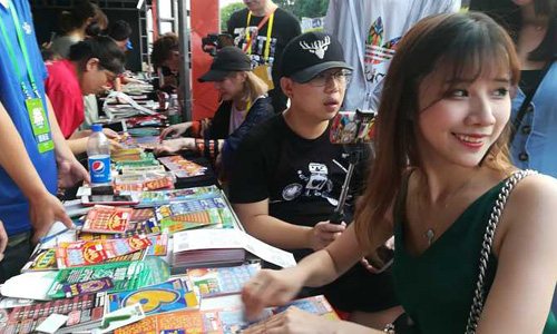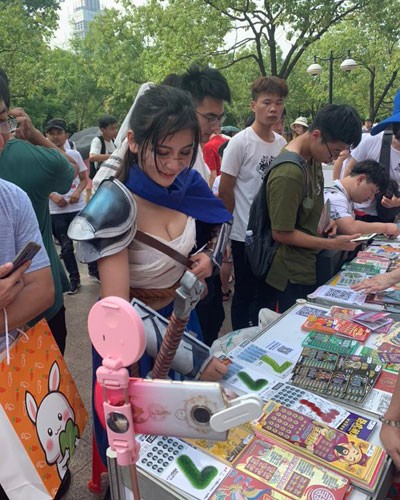 很多美女、帅哥网红主播,拿着自己形式各异的装备,坐在展位前开始体验顶呱刮的快乐!