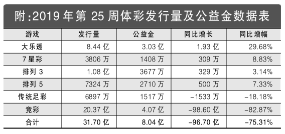 6月17日至23日,体彩全国联销游戏(大乐透、7星彩、排列3、排列5、传统足彩、竞彩)通过31.70亿元的发行量,筹集了8.04亿元公益金。当周发行量比去年同期减少96.70亿元,同比降低75.31%。当周共开出21注500万元及以上大奖,其中体彩大乐透19注,7星彩2注。去年同期,俄罗斯世界杯进入第二周,竞彩发行量爆发式增长,截至目前,2018年第25周的周发行量仍保持着单周最高纪录,这也是近期体彩周发行量同比下降较多的主要原因。