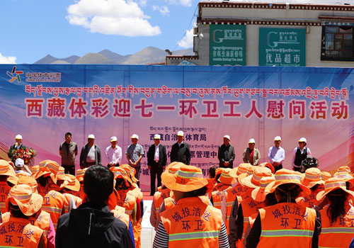 7月1日下午,西藏体彩中心围绕“不忘初心、牢记使命”主题教育活动,在建党98周年之际,以慰问环卫工人彰显“公益体彩 乐善人生”的理念,并以拉萨市市民服务中心广场为活动举办主会场,各地市为分会场相继开展了环卫工人慰问活动,拉萨市主会场共计慰问人数200人,发放慰问金20万元。自治区体育局党组书记刘伯清、副巡视员朱安乐、拉萨市城管局局长赵铁岭、西藏博瑞设施管理有限公司董事长多吉优加、拉萨城投洁达环卫有限公司相关领导出席了拉萨市环卫工人慰问活动。