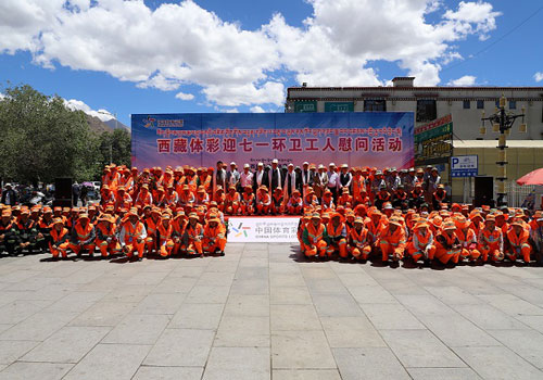 慰问活动上自治区体育局党组书记刘伯清为拉萨城投洁达环卫有限公司颁发了慰问牌并献上了哈达。