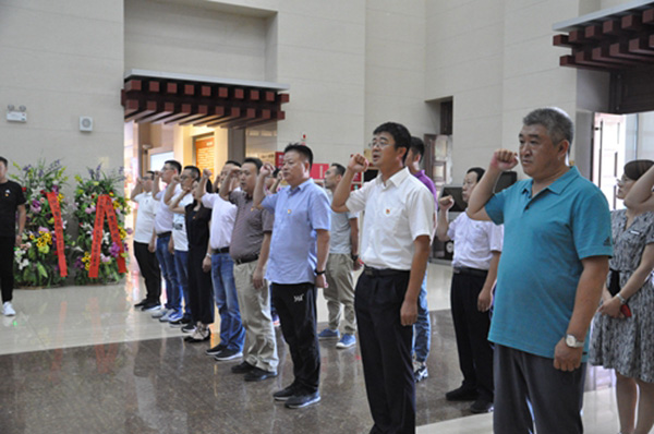 在纪念馆前的广场上,大家怀着崇敬的心情,缓步走进纪念馆大厅,全体人员在庄严肃穆的氛围中,向孔繁森雕像敬献花篮,行三鞠躬礼,表达深切缅怀之情。全体党员面对孔繁森雕像一侧的党旗,举起右拳,重温入党誓词。