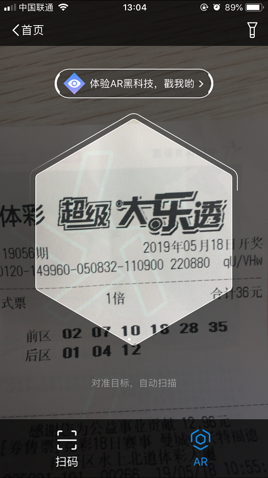 玩法一“大乐透在身边”:进入支付宝AR扫,扫描任意大乐透票面或“超级大乐透”五字都可以进入游戏。