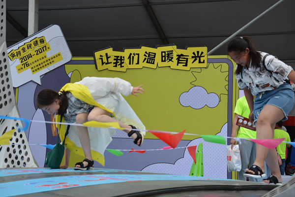 除了合影打卡外,另外3个打卡项目更是让大家大呼过瘾:射击游戏紧张刺激,翻阅彩虹桥时手脚并用,穿越指压板更带来了更多酸爽的体验。