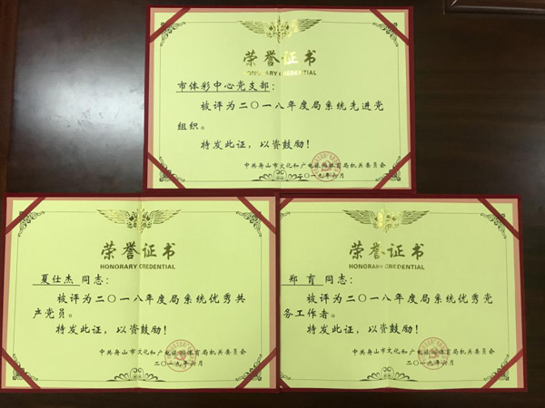 6月25日,在中共舟山市文化和广电旅游体育局机关委员会组织的表彰大会上,舟山市体育彩票管理中心党支部获评2018年度局系统先进党组织,支部书记夏仕杰同志获评2018年度局系统优秀共产党员,支部副书记郑育同志获评2018年度局系统优秀党务工作者。