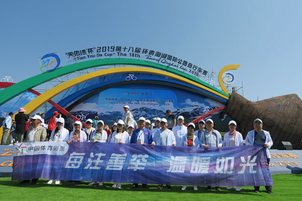 精彩的开幕式怎少得了体彩人的身影。由青海体彩业主、销售员组成的区域引人注目。白色的“顶呱刮”遮阳帽、皮肤衣,写有“每注善举 温暖如光”的公益条幅。没错!这就是来自青海体彩的30人现场助威方阵,他们以“动感、年轻、活力”的面貌为第十八届环湖赛加油!