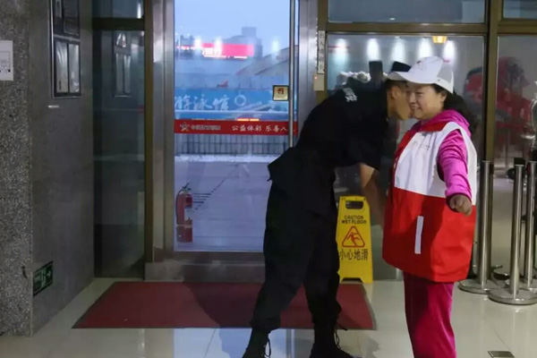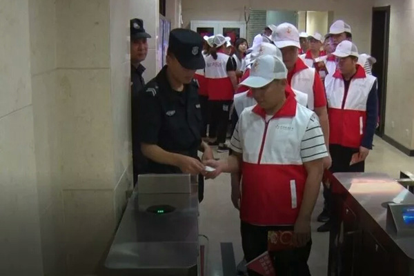 观摩团成员排队接受安检并登记存储随身物品。