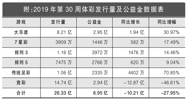 当周大乐透通过8.21亿元的发行量,筹集了2.95亿元公益金。当周发行量比去年同期增加1.94亿元,同比增长30.97%。