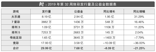 8月5日至11日,体彩全国联销游戏(大乐透、7星彩、排列3、排列5、传统足彩、竞彩)通过29.99亿元的发行量,筹集了7.68亿元公益金。当周发行量比去年同期减少8.09亿元,同比降低21.25%。当周共开出13注500万元及以上大奖,其中体彩大乐透7注,7星彩5注,传统足彩1注。当周同比发行量减少部分全部来自竞猜型游戏。