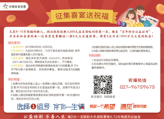 您结婚快乐多多,体彩也有祝福多多!8月25日之前,湖北体彩将在省内征集百场喜宴,为举办婚礼的新人及其亲友送去特别的礼物:送新人象征爱情甜蜜的600元顶呱刮即开票一本;颁发“百年好合”公益证书;免费赠送每位来宾一张有3次冲击1800万元大奖的大乐透彩票,彩票号码还将参考您和您爱人生日、结婚日期等具有纪念意义的数字,是特别定制哦……