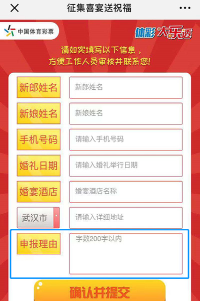 原来,这些给湖北体彩官方微信后台留言的新人们,正在参与湖北体彩“征集喜宴送祝福”活动。该活动一经推出,已经有200多对新人提交了申请。
