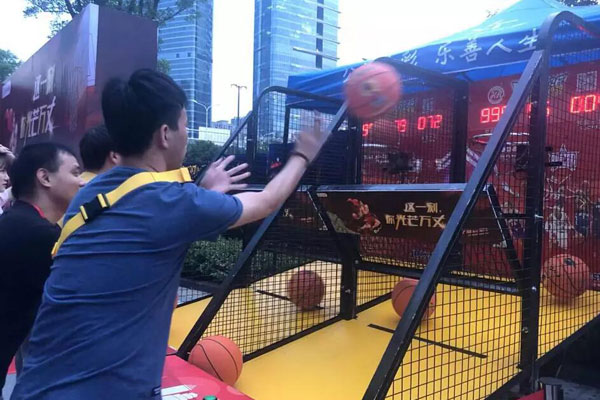 在应援墙右侧摆放了大中小三种规格的投篮机6台,小型投篮机和中型投篮机不计分,大投篮机则不同,每分钟投进28个球就会获得10元竞猜篮球彩票。不少人跃跃欲试,排队等候。