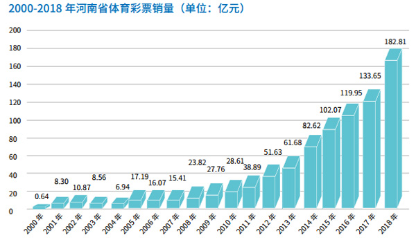 《报告》显示,2018年,河南体育彩票销售182.8亿元,为国家社会筹集公益金43亿元,均创历史新高。截至2018年底,河南体育彩票累计销售937亿元,筹集体彩公益金254亿元。