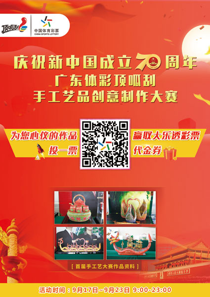 为献礼新中国成立70周年和体育彩票发行25周年,丰富广东省体彩从业人员业余文化生活,提升销售队伍凝集力,传播体育彩票“责任、诚信、团结、创新”的精神文化,广东体彩近期开展全省第二届体彩顶呱刮手工艺品创意制作大赛,并于9月17日至23日期间每日9:00-23:00在广东体彩官微举行有奖投票评选活动,投票者有机会抽中金额不等的大乐透彩票代金券。