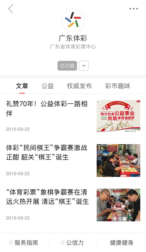 广东体彩南方号是集彩票公益报道、权威发布信息、彩市趣闻等内容于一体的官方信息平台,在底部菜单栏设有服务指南、公信力、健身健康三个功能区块,为网民提供开奖兑奖信息、体彩实体店申请、健身健康知识等实用信息。广东体彩南方号内容形式丰富多样,用户使用体验快捷便利,可以说,网民只需一号在手,所有与广东体彩相关的线上需求都将得到响应。