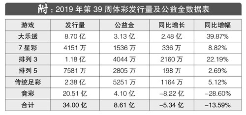 当周竞猜型游戏通过22.90亿元的发行量,筹集了4.62亿元公益金。当周发行量比去年同期减少8.10亿元,同比降低26.13%。