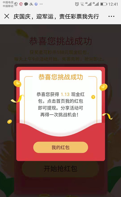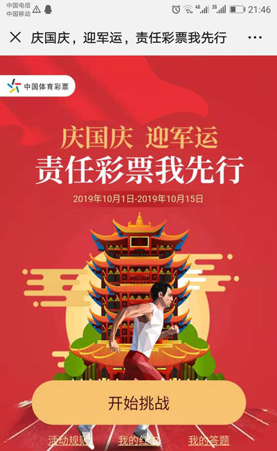 国庆七天假结束了,你是否跟小编一样对假期的美好生活意犹未尽?湖北体彩开展的“庆国庆,迎军运,责任彩票我先行”答题闯关抢红包活动,在假期结束后依然可以继续参加哦!