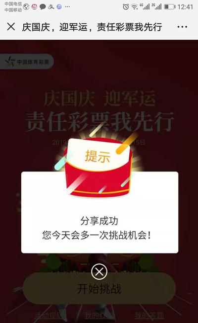 距离“庆国庆,迎军运,责任彩票我先行”答题闯关活动结束时间日益临近,没有参与的购彩者们请抓紧时间,也可分享活动链接给好友一起参与抢红包。