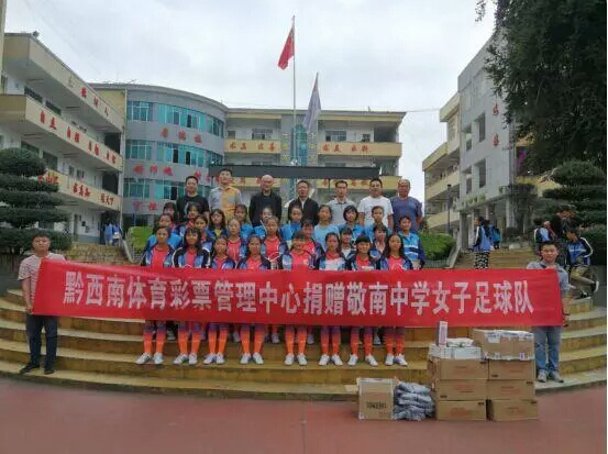 9月18日,贵州黔西南州体彩中心工作人员驱车赶往兴义市敬南镇中学,对这所学校女子足球队的25位贫困学生开展了捐助活动。