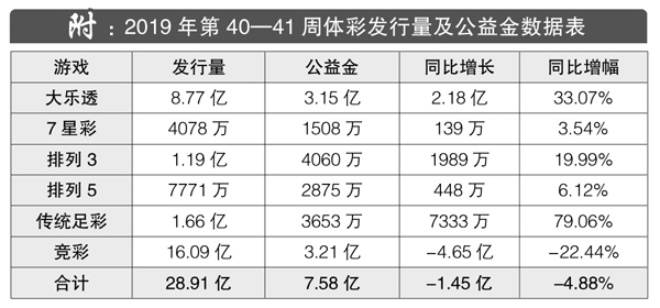 9月30日至10月13日,体彩全国联销游戏(大乐透、7星彩、排列3、排列5、传统足彩、竞彩)通过28.91亿元的发行量,筹集了7.58亿元公益金。当周期发行量比去年同期减少1.45亿元,同比降低4.88%。当周期共开出15注500万元及以上大奖,其中体彩大乐透13注,7星彩2注。由于国庆节休市7天,当周期实际销售天数为7天。