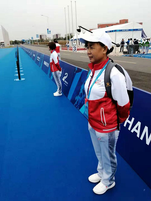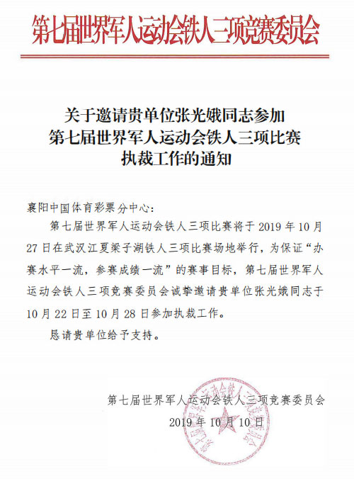 虽然只是一名普通的体彩销售点代销者,但张光娥身上有很多并不普通的地方,她特别爱户外运动,尤其擅长长跑。她的微信名就叫“蓝天白云”,大约与她爱好户外运动有关。张光娥兼任着襄阳市铁人三项运动协会的会长,是中国铁人三项运动协会的资深会员。铁人三项运动包含天然水域游泳、公路自行车、公路长跑三个连贯运动项目,是奥运会、亚运会的比赛项目之一。一位女同胞,能够担任这个运动协会会长,必定是“有几把刷子”的“铁人”。此次与张光娥一起执裁军运会铁人三项赛事的,还有襄阳市铁人三项运动协会的另外3名会员罗征宇、李东旭、龙伟军。此前他们都经过中国铁人三项运动协会的理论培训和实践执裁考核,获颁国家一级裁判员证书。10月10日,第七届世界军人运动会铁人三项竞赛委员会专门向体彩襄阳分中心发出邀请函,邀请张光娥担任本次比赛的裁判员。