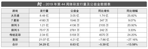 10月28日至11月3日,体彩全国联销游戏(大乐透、7星彩、排列3、排列5、传统足彩、竞彩)通过34.29亿元的发行量,筹集了8.63亿元公益金。当周发行量比去年同期减少5.39亿元,同比降低13.58%。当周共开出14注500万元及以上大奖,其中体彩大乐透12注,7星彩2注。