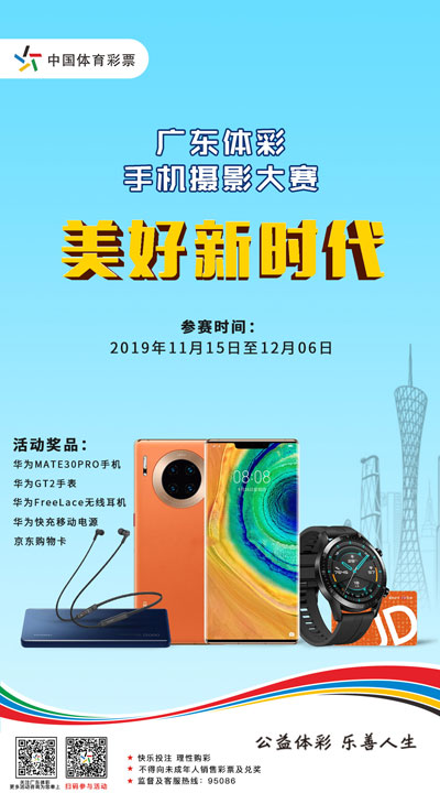 为见证、记录美好新时代,展现责任体彩、公益体彩的社会形象,传播积极向上的社会氛围,由广东省体育彩票中心主办的“美好新时代”广东体彩手机摄影大赛将于2019年11月15日正式启动,并向摄影爱好者发出诚挚邀请。