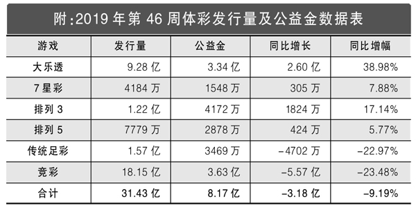 当周竞猜型游戏通过19.72亿元的发行量,筹集了3.97亿元公益金。当周发行量比去年同期减少6.04亿元,同比降低23.44%。
