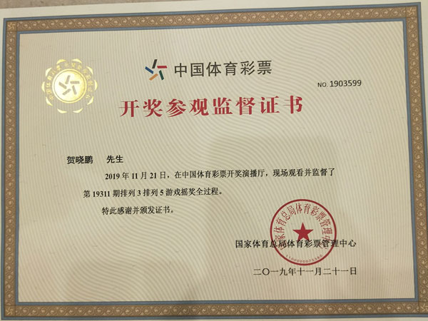 开奖过程结束后,国家体彩中心还为这40位幸运观众颁发了《开奖参观监督证书》。
