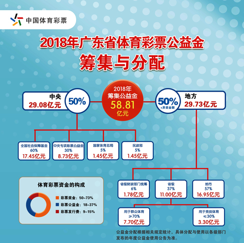体彩公益金按照中央与地方1:1的比例分配,中央部分主要用于社会公益事业。以2018年为例,广东体彩筹集公益金58.81亿元,上缴中央公益金就达到29.08亿元,其中17.45亿元补充到全国社保基金,而这部分资金将专门用于人口老龄化高峰时期的养老保险等社会保障支出的补充、调剂。换句话说,全国社保基金与我们每个人都息息相关,我们每个人都是体彩公益金的受益者。