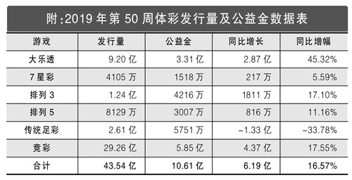 当周大乐透通过9.20亿元的发行量,筹集了3.31亿元公益金。当周发行量比去年同期增加2.87亿元,同比增长45.32%。