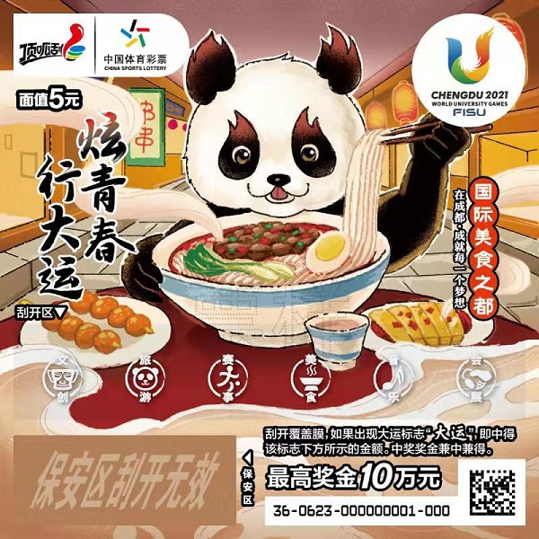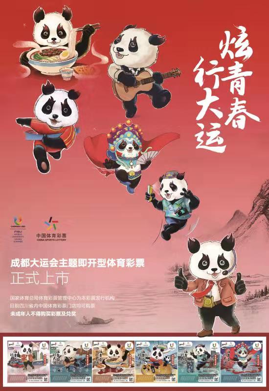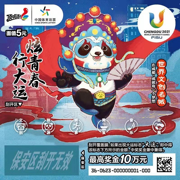 此次首发仪式由大运会成都筹委会、四川省体彩中心主办。仪式现场对“炫青春 行大运”即开型体育彩票进行了展示,憨态可掬的国宝大熊猫与“三城三都”元素相融合,从票面图案就可以领略到文创成都的涵养、旅游成都的休闲、赛事成都的激情、美食成都的风味、音乐成都的律动以及会展成都的繁荣。每一张“炫青春 行大运”彩票都是成都的城市名片,也是大运会文创产品的一员。