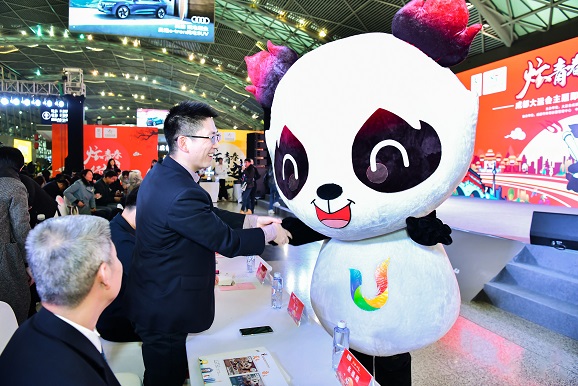 1月17日下午,在四川成都双流国际机场T2号航站楼,将要通过安检的乘客被成都大运会吉祥物“蓉宝”吸引,驻足在“炫青春 行大运”成都大运会主题即开型体育彩票首发仪式现场。“蓉宝”为旅客送上了大运会主题即开型体育彩票,并献上来自成都大运会的祝福:“春节行大运!”