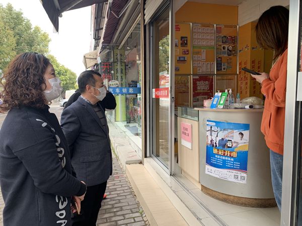 在景元路3310073508实体店,吕彤详细检查了体温计、消毒液、体温检查记录表等疫情防控措施落实情况。
